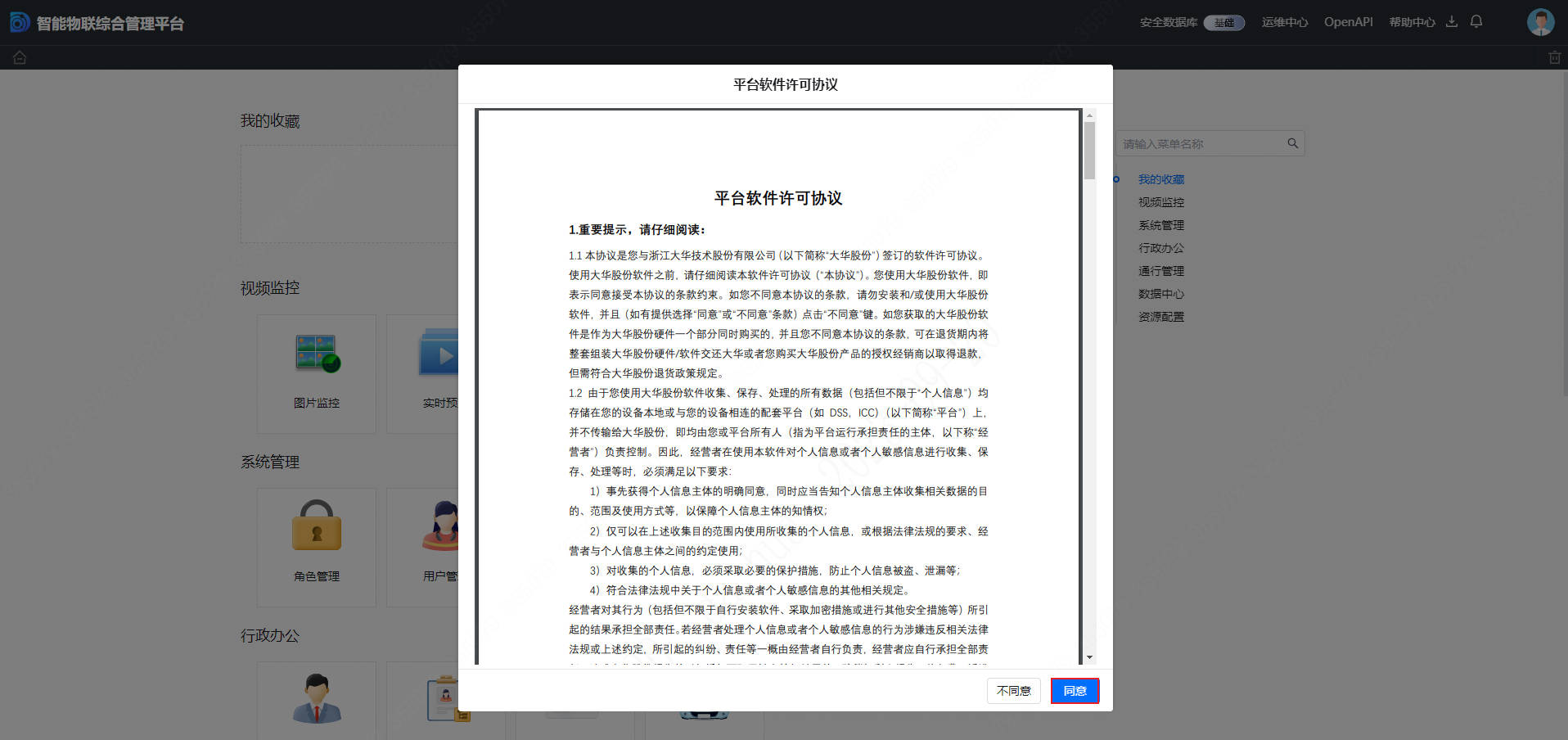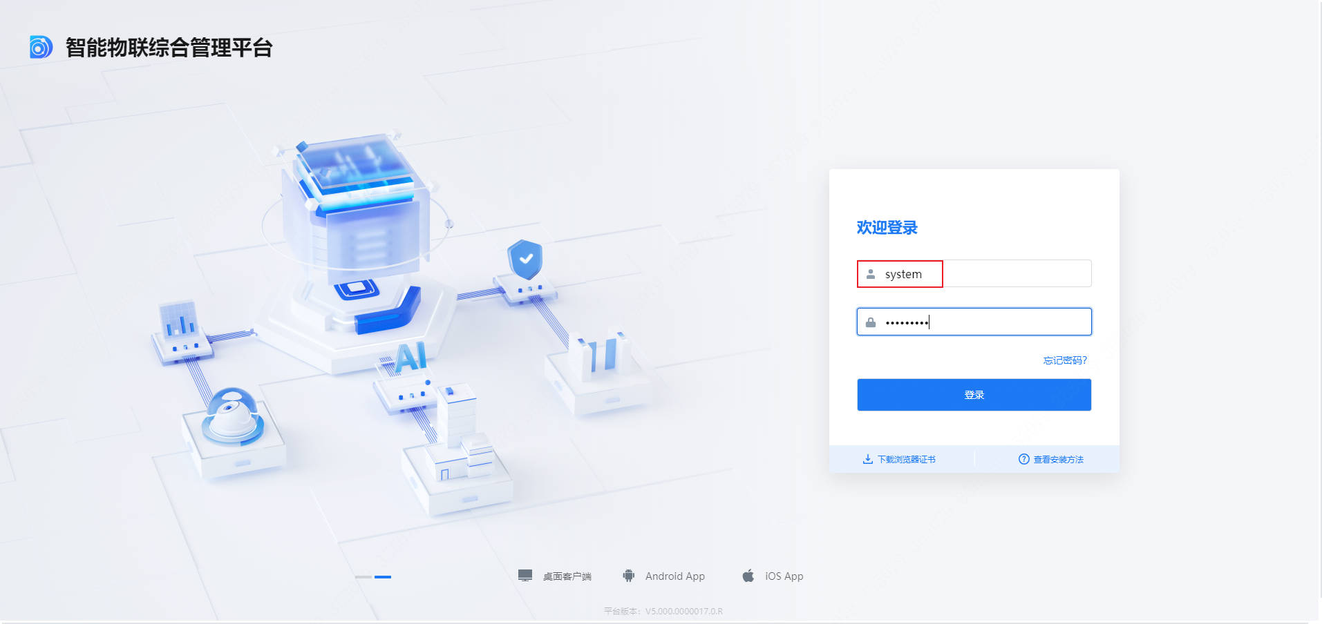 2.平台访问地址为 https://平台IP:端口(默认端口为 443),用户名和密码由区域技术人员提供,访问凭证可由区域技术人员/客户(知晓超级管理员system用户密码)申请