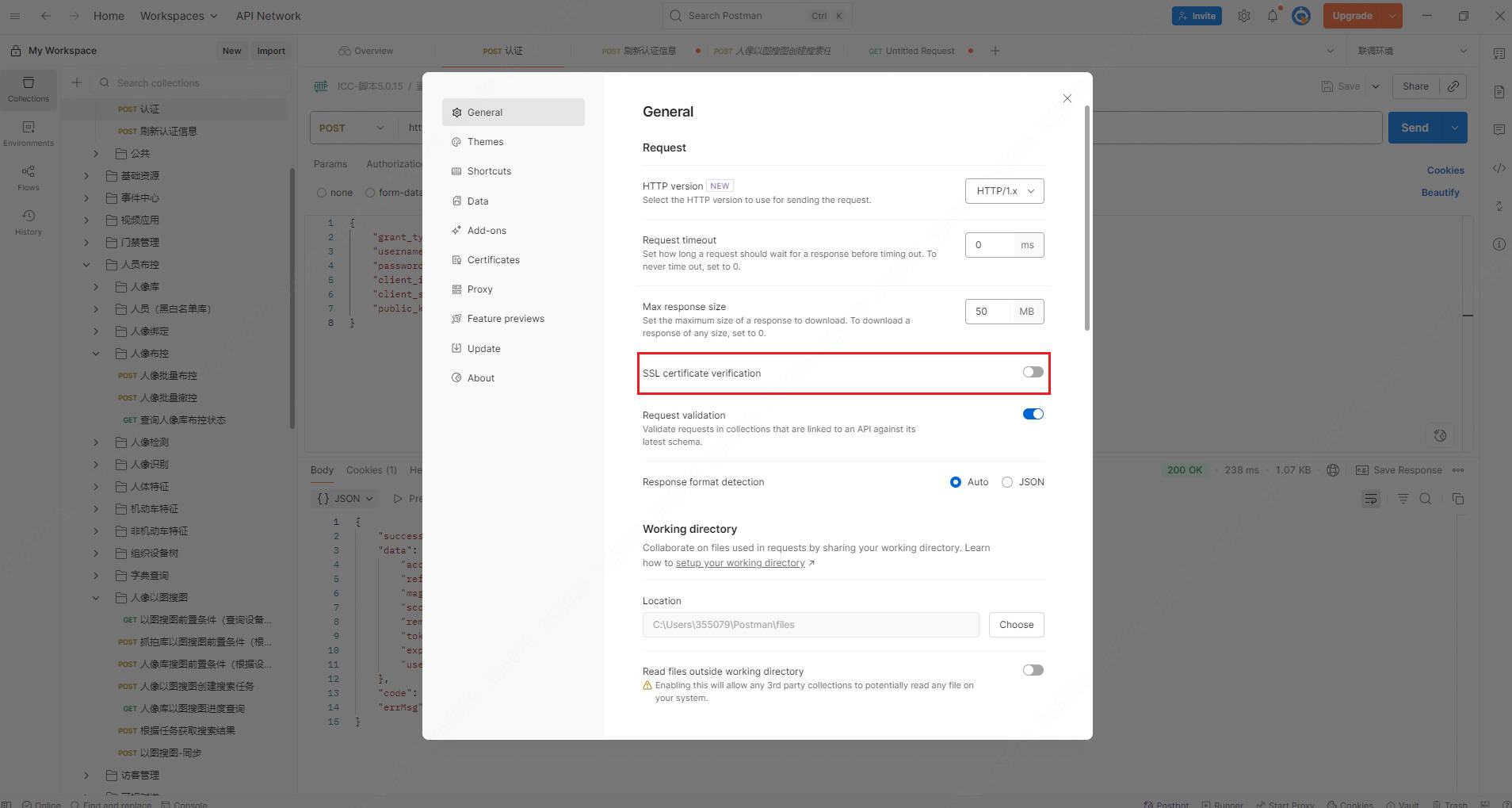 为确保 Postman 正常运行,请在设置中关闭 SSL 证书校验